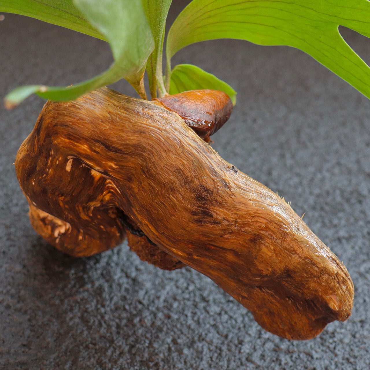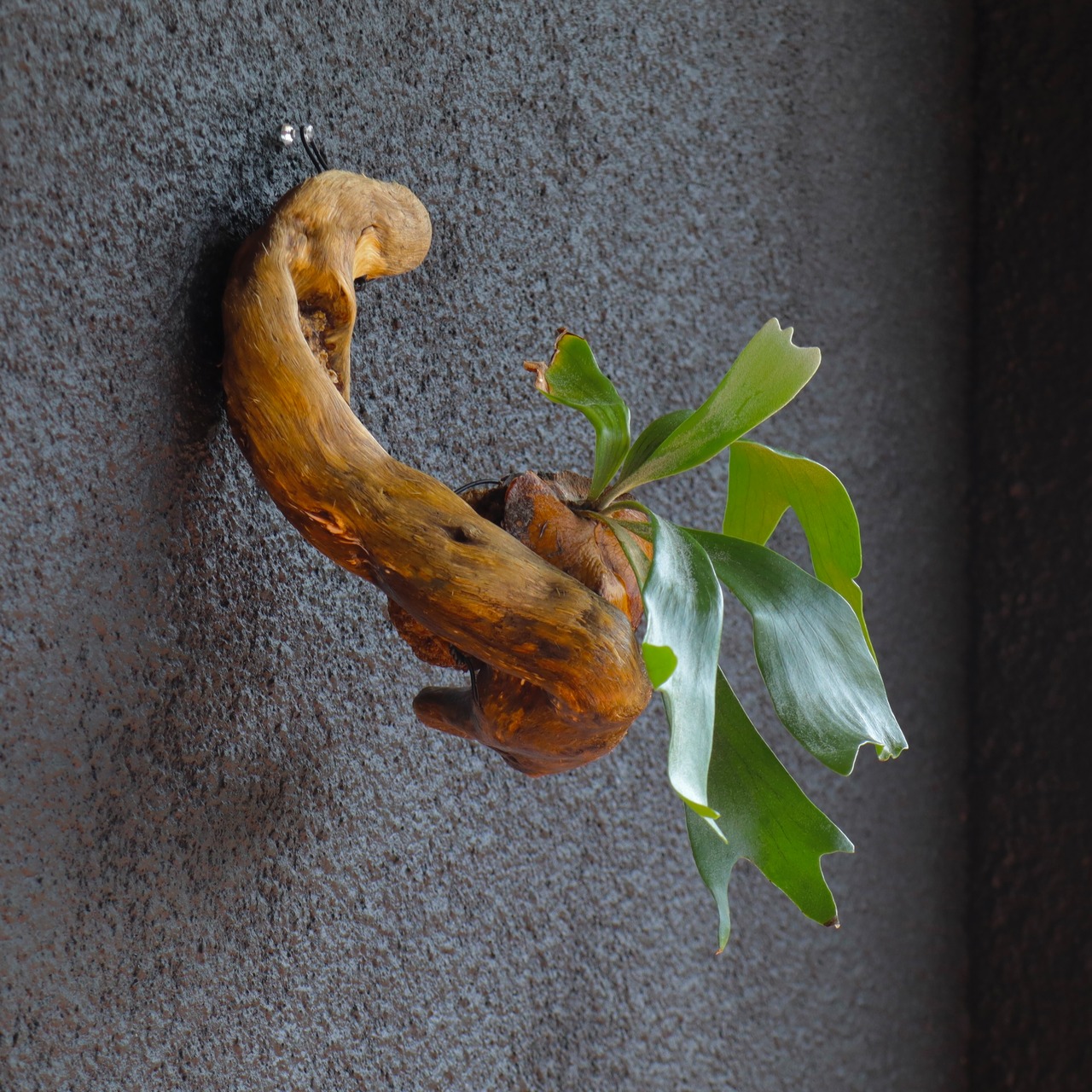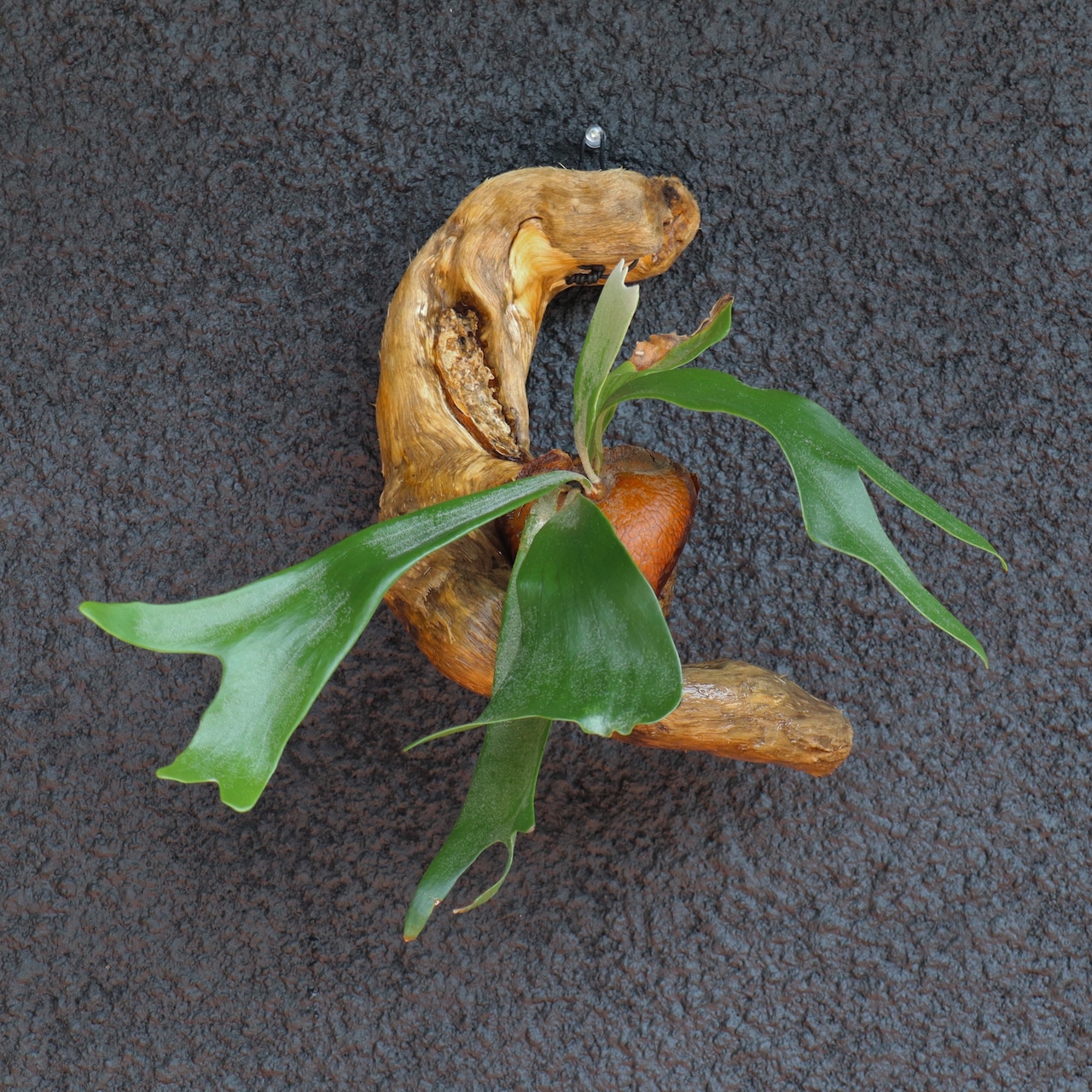 苔玉に仕立てたビカクシダ (コウモリラン) を、流木に着生させました。流木は高知県産のものを使用しています。壁掛け用のフック付き。